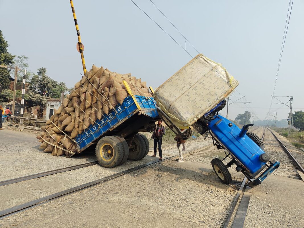 जमानियां (गाजीपुर)। रेलवे स्टेशन के बाईपास रेलवे फाटक पर उस समय अफरा तफरी मच गई जब मंगलवार की दोपहर धान लदा एक ट्रैक्टर की ट्रॉली रेलवे लाइन के बीच पलट गया। आस पास मौजूद लोगों के सहयोग से ट्रैक्टर ट्रॉली व ट्रैक पर बिखरे धान की बोरियों को हटवा कर रेल ट्रैक खाली कराया गया। बताया जा रहा है कि जमानियां की तरफ से ओवरलोड धान की बोरी लेकर एक ट्रैक्टर चंदौली के अमड़ा स्थित राइस मिल पर जा रहा था। अभी वह रेलवे बाईपास फाटक के पर पहुंचा ही था कि अचानक ट्रैक समतलीकरण न होने के कारण दोनों ट्रैक के बीच ट्रैक्टर ट्रॉली अनियंत्रित होकर पलट गया। यह देख फाटक से गुजर रहे राहगीरों में अफरा तफरी मच गई। इसके बाद आस पास के लोगों ने धान की बोरियों को रेलवे ट्रैक से हटवाया और ट्रैक्टर सीधा होने के बाद रेल ट्रैक को खाली कराया गया। इस दौरान कुछ समय तक एनएच 24 पर यातायात प्रभावित रहा। इसके चलते करीब पांच मिनट तक पटना डीडीयू मेमू पैसेंजर ट्रेन गड़ही गांव के सामने खड़ी रही। सूचना पर पहुंचे आरपीएफ ने ट्रैक्टर चालक मनोज कुमार से पूछताछ की। इस संबंध में आरपीएफ दिलदारनगर उपनिरीक्षक नवीन कुमार ने बताया कि मामला संज्ञान में है, छानबीन की जा रही है।