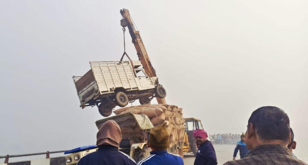 जमानियां गाजीपुर। स्थानीय पुल पर शनिवार तड़के घने कोहरे के कारण बड़ा हादसा हो गया। धान लदा एक ट्रैक्टर-ट्रॉली और गौ-वंशी से लदे पिकअप की आमने-सामने की जोरदार टक्कर हो गई। टक्कर इतनी भीषण थी कि पिकअप का पिछला हिस्सा पुल की रेलिंग पर चढ़ गया। जिससे पुल पर कुछ देर के लिए अफरा-तफरी मच गई।हादसे के बाद ट्रैक्टर और पिकअप चालक मौके से फरार हो गए। सूचना मिलने पर पुलिस मौके पर पहुंच गई। पुलिस ने क्रेन की सहायता से पिकअप को सुरक्षित पुल से नीचे उतारकर कोतवाली पहुंचाया। संयोग रहा कि कोई बड़ा हादसा नहीं हुआ। पुलिस के अनुसार घने कोहरे के कारण दृश्यता काफी कम थी, जिससे यह दुर्घटना हुई। पुलिस फरार चालकों की तलाश कर रही है। स्थानीय लोगों ने कोहरे के मौसम में पुल पर सुरक्षा व्यवस्था और यातायात नियंत्रण को लेकर प्रशासन से सतर्कता बढ़ाने की मांग की है।