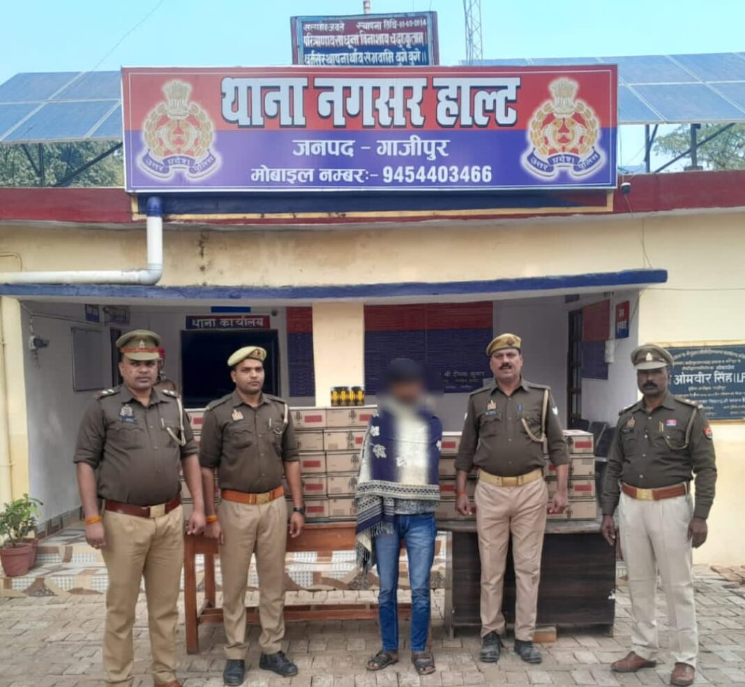 नगसर गाजीपुर। नगसर हाल्ट थाना पुलिस ने 15 दिसंबर को सूर्यभानपुर नहर पुलिया के पास चेकिंग के दौरान एक कार से 37 पेटी अंग्रेजी शराब बरामद किया है। इस मामलेमें एक युवक को गिरफ्तार किया है। बरामद शराब की कीमत दो लाख 13 हजार रूपये आंकी गयी है। थानाध्यक्ष नगसर ओमप्रकाश पुलिस टीम के साथ वाहन चेकिग कर रहे थे। मुखबिर की सूचना पर पुलिस सूर्यभानपुर नहर पुलिया के पास पहुंचकर वाहन चेकिंग करने लगी। इसी दौरान एक गाडी आती दिखाई दी। पुलिस ने उसे रोका। कार की तलाशी लेने पर उसमें रखा 37 पेटी अंग्रेजी शराब बरामद किया। पुलिस एक युवक को गिरफ्तार किया है।पूछताछ करने पर युवक ने अपना नाम रोहतास बिहार के करगहा थाना के अरारुआ निवासी शमशाद अंसारी बताया। पुलिस का कहना है कि पकड़ा गया तस्कर शराब लेकर बिहार बेचने जा रहा था।