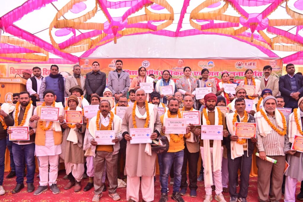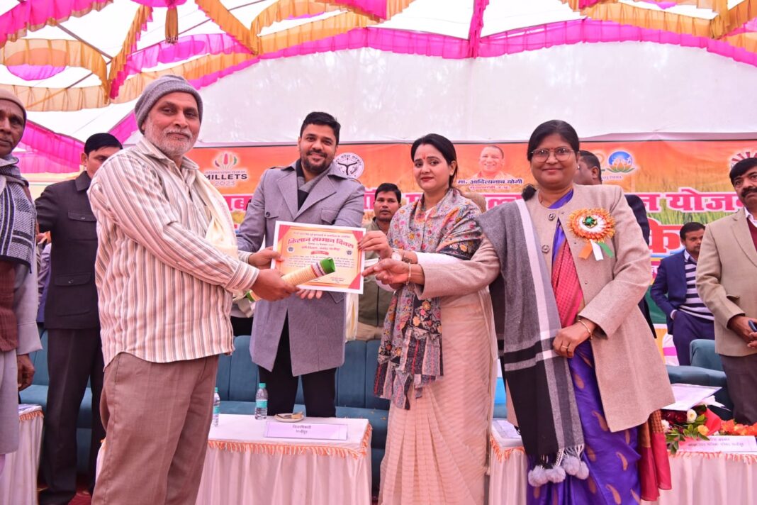 किसान सम्मान समारोह में कृषि, उद्यान, पशुपालन एवं दुग्ध विकास के क्षेत्र में सर्वोच्च उत्पादकता प्राप्त करने वाले 36 कृषकों को प्रशस्ति पत्र एवं अंगवस्त्र देकर जिलाधिकारी, जिला पंचायत अध्यक्ष एवं नगर पालिका अध्यक्ष ने पुरस्कृत गया। जिनमें एफपीओ का सर्वाधिक टर्न ओवर प्राप्त करने वाले रूद्र प्रताप सिंह, औषधीय पौधों की खेती एवं उत्पाद की बिक्री में जिले को पहचान दिलाने वाले रंग बहादुर सिंह, श्री अन्न के विभिन्न उत्पादों एवं विशेष प्रकार की दही की ब्रान्डिंग करने वाले रामधारी सिंह यादव, महिला कृषि उद्यमी के रूप में अपनी पहचान बनाने वाली अंजू चतुर्वेदी, सेव की खेती के बाद कीवी उत्पादन की ओर अग्रसर एवं प्राकृतिक खेती योजना के कृषक मास्टर ट्रेनर सुनील सिंह कुशवाहा, टीश्यू कल्चर से केले की खेती एवं उसके साथ मसालों की अन्तः फसली खेती करने वाले अनूप राय को भी सम्मानित किया गया।