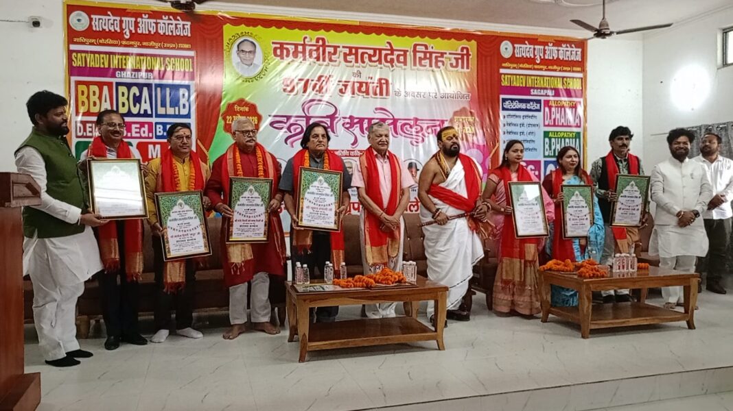 गाजीपुर। सत्यदेव ग्रुप ऑफ़ कॉलेजेज’ के संस्थापक कर्मवीर सत्यदेव सिंह की सत्तानवीं जन्म जयंती गाधिपुरम,बोरसिया परिसर में काव्य-उत्सव के रूप में मनाई गई। यह केवल एक जयंती नहीं थी, अपितु शब्दों की साधना, कर्म की आराधना एवं भारतीय साहित्यिक चेतना का एक जीवंत महाकुंभ था। सबसे पहले कर्मवीर के चित्र पर श्रद्धासुमन अर्पित किए गए। देवी माँ वीणापाणि के प्रतिमा पर पुष्पांजलि के साथ कार्यक्रम का शुभारंभ हुआ। मुख्य अतिथि जयप्रकाश विश्वविद्यालय, छपरा के पूर्व कुलपति प्रो. हरिकेश सिंह उपस्थित रहे। अध्यक्षता मिशिगन, अमेरिका स्थित गीता फाउंडेशन के संस्थापक श्री योगी आनंद महाराज ने किया। सत्यदेव ग्रुप की संरक्षिका सावित्री देवी, मुख्य प्रबंध निदेशक डॉ. आनंद सिंह, प्रबंध निदेशक डॉ. सानंद सिंह, प्रबंधक सुमन सिंह, प्रबंधक डॉ. प्रीति सिंह, काउंसलर दिग्विजय उपाध्याय एवं डायरेक्टर श्री अमित रघुवंशी आदि उपस्थित रहे। सत्यदेव स्कूल, के बाल-कलाकारों ने स्वागत गीत, गणेश वंदना एवं सरस्वती वंदना के मधुर संगम से मन मोह लिया, वहीं बीसीए के विद्यार्थियों ने नारी सशक्तिकरण पर आधारित नृत्य की मनोहारी प्रस्तुति से समा बाँध दिया।कवि सम्मेलन में जब शब्दों ने अंगड़ाई ली तो पूरा सभागार झूम उठा।मंच संचालन वरिष्ठ कवि राजेंद्र त्रिपाठी ‘लालू तिवारी’ ने किया। मुख्य प्रबंध निदेशक प्रो. आनंद सिंह एवं प्रबंध निदेशक प्रो. सानंद सिंह ने सभी आमंत्रित कवियों का अंगवस्त्र, स्मृति चिन्ह एवं माल्यार्पण से सत्कार किया।
