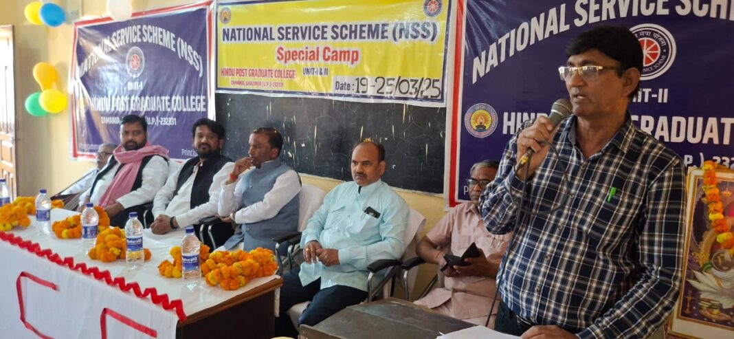 जमानियां (गाजीपुर)। हिंदू पीजी कालेज में राष्ट्रीय सेवा योजना के सात दिवसीय शिविर का शुभारंभ प्राचार्य प्रो. श्रीनिवास सिंह एवं मुख्य अतिथि मन्नू सिंह ने माँ सरस्वती की चित्र पर माल्यार्पण एवं दीप प्रज्वलन कर किया। मन्नू सिंह ने स्वयंसेवकों को समाज सेवा के प्रति समर्पित रहने की प्रेरणा दी और अपने जीवन को सार्थक बनाने का संदेश दिया। उन्होंने कहा कि छात्राएं राष्ट्रीय सेवा योजना के माध्यम से सामुदायिक सेवा एवं राष्ट्र निर्माण के कार्यों में भागीदारी कर अपने व्यक्तित्व को बहुआयामी बना सकती हैं। इससे उन्हें हर क्षेत्र में सफलता प्राप्त करने में मदद मिलेगी। अध्यक्षीय उद्बोधन में प्राचार्य प्रो. श्रीनिवास सिंह ने छात्र- छात्राओं को भी बड़े सपने देखने के लिए प्रेरित किया। कार्यक्रम अधिकारी डॉ.अभिषेक तिवारी ने बताया कि यह विशेष शिविर 19 मार्च से 25 मार्च तक चलेगा। शिविर के अंतर्गत ग्राम स्वच्छता, वित्तीय साक्षरता, नशा मुक्ति, मतदाता जागरूकता रैली, टीकाकरण, वृक्षारोपण आदि कार्यक्रमों का आयोजन किया जाएगा। उद्घाटन समारोह में आईक्यूएसी प्रभारी डॉ.अरुण कुमार, डॉ संजय कुमार सिंह सहित अन्य कर्मचारीगण उपस्थित रहे। संचालन वरिष्ठ कार्यक्रम अधिकारी डॉ राकेश कुमार सिंह तथा धन्यवाद ज्ञापन कार्यक्रम अधिकारी डॉ अभिषेक तिवारी ने प्रस्तुत किया।