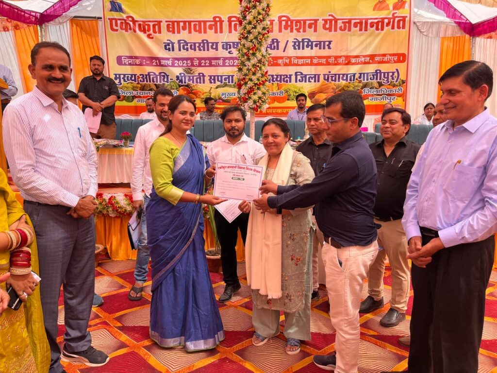 गाजीपुर। एकीकृत बागवानी विकास मिशन योजना के तहत कृषि विज्ञान केन्द्र में दो दिवसीय गोष्ठी का उद्घाटन 21 मार्च को मुख्य अतिथि जिला पंचायत अध्यक्ष सपना सिंह ने दीप प्रज्जवलन कर किया। गोष्ठी में वैज्ञानिक डा० वीके सिंह ने औद्यानिक फसलों, फलों, सब्जियों को उगाने तथा रख-रखाव के बारे में बताया। वैज्ञानिक विधि से शाकभाजी की खेती, ड्रेगन फ्रूट, जैविक सब्जी खेती उत्पादन तथा निर्यात करने के मापदंड सब्जी उत्पादन पर व्याख्यान दिया गया। कृषि विज्ञान केंद्र के वैज्ञानिक डा० ओमकार सिंह ने बागवानी फसलों की जैविक खेती एवं अधिक से अधिक फलोत्पादन तथा संरक्षित खेती (पॉली हाउस/ग्रीन हाउस) के विषय में किसानों को जानकारी दिये ।