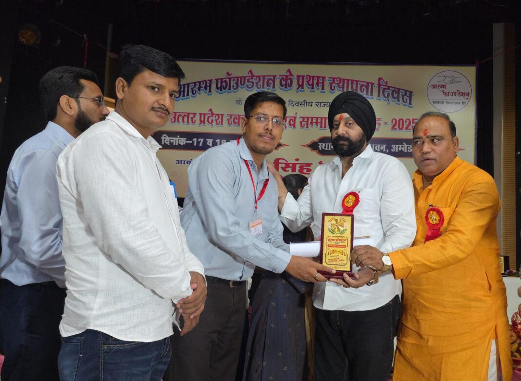 गाजीपुर। आरम्भ फाउंडेशन अंबेडकरनगर की ओर से लोहिया भवन सभागार में 17 व 18 मई को अंबेडकरनगर में दो दिवसीय उत्तर प्रदेश रक्तकुम्भ और सम्मान समारोह का आयोजन किया गया। जिसमें जीवन रक्षक फाउंडेशन गाज़ीपुर के संस्थापक और एसोसिएशन ऑफ पूर्वांचल ब्लड डोनर्स के सचिव शीर्ष दीप शर्मा को राष्ट्र गौरव सम्मान से सम्मानित किया गया। इस कार्यक्रम में प्रदेश के 35 जिलों के समाजसेवी और रक्तदाताओं को सम्मानित किया गया। कार्यक्रम में रक्तदानियों का उत्साह बढाने के लिए प्रदेश मे सबसे अधिक 223 बार रक्तदान करने वाले रक्तदाता प्रदीप इसरानी भी वाराणसी से उपस्थित रहे और उन्हे भी शान ए उत्तर प्रदेश सम्मान से सम्मानित किया गया।शीर्ष दीप को मुख्य अतिथि राज्य सरकार द्वारा वीर गुरु गोविंद सिंह वीरता पुरस्कार से सम्मानित, 1000 कन्याओं का कन्यादान करने वाले, समाजसेवी धर्मवीर सिंह बग्गा, विशिष्ट अतिथि शिव कुमार गुप्ता (अध्यक्ष व्यापार मंडल अंबेडकरनगर) एवं महाराष्ट्र राज्यपाल द्वारा सम्मानित कार्यक्रम की आयोजक व आरम्भ फाउंडेशन की संस्थापिका संध्या सिंह ‘समीप’ ने संयुक्त रूप से सम्मानित किया। शीर्ष दीप शर्मा ने कहा कि अंबेडकरनगर में सम्मान प्राप्त करना मेरे लिए बड़े सौभाग्य की बात है। मेरे लिये सबसे गर्व का विषय यह है कि एक निस्वार्थ सेवा करने वाले समाजसेवियों के हाथों सम्मान पाना अपने आप में एक बहुत बड़ा सम्मान है और हम सभी का उद्देश्य सिर्फ सम्मान प्राप्त करना नही है। बल्कि ऐसे कार्यक्रमों में उपस्थित होकर एक दूसरे से परिचय प्राप्त कर अपने जनपद के साथ साथ अन्य जनपद में रक्त की आवश्यकता होने पर एक दूसरे के सहयोग से रक्त मुहैया कराया जा सके। ताकि बिमारी से भले किसी की जान जाये परन्तु रक्त की कमी से किसी की जान ना जाये। उन्होने कहा कि यह सम्मान जीवन रक्षक फाउंडेशन गाजीपुर टीम के योगदान का प्रतिफल है इसलिये यह सम्मान संस्था के हर सदस्य सहित समस्त सहयोगियों, मार्गदर्शकों व जिले को समर्पित है।आपको बता दें कि शीर्ष दीप व उनकी संस्था जीवन रक्षक फाउंडेशन गाजीपुर में चार वर्षों से रक्तदान के क्षेत्र में कार्य कर रही है।