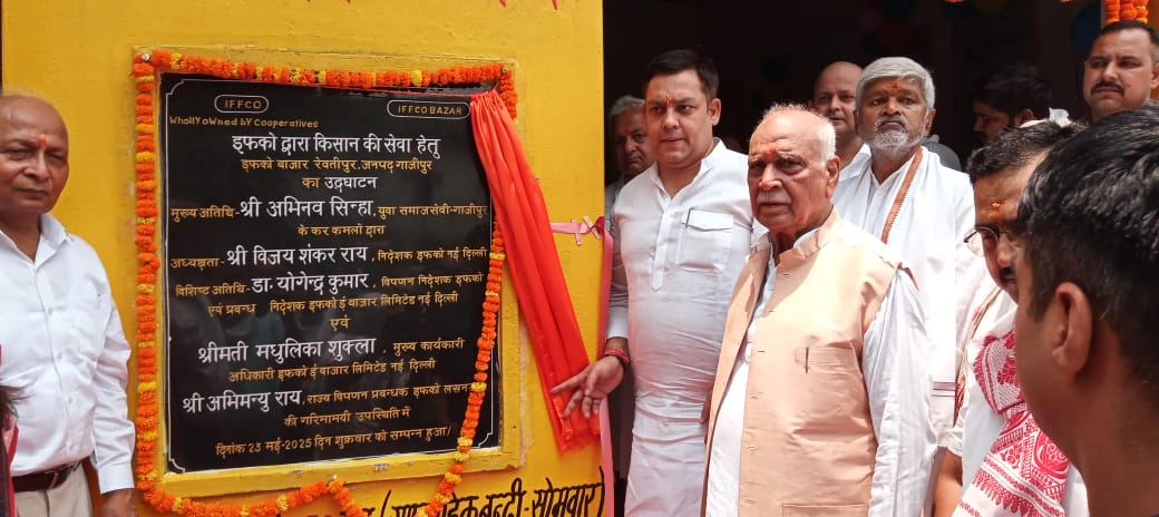 रेवतीपुर गाजीपुर। स्थानीय गाँव में शुक्रवार को इफको बाजार का उद्घाटन मुख्य अतिथि अभिनव सिन्हा ने फीता काटकर एवं शीलापट्ट का अनावरण कर किया।इस दौरान फसल उत्पादकता वृद्धि पर विचार गोष्ठी का भी आयोजन किया गया। गोष्ठी में किसानों को खेती,फसलों की सुरक्षा, उर्वरक, दवाओं आदि के बारे में जानकारी देने के साथ ही मिट्टी के उर्वरा शक्ति के बारे में भी जानकारी इफको के अधिकारियों ने दिया। इस दौरान पांच प्रगतिशील किसानों को स्प्रे मशीन वितरित किया गया। अभिनय सिन्हा ने कहा कि इफको बाजार खुलने से अब इलाके के लोगों को खाद,बीज,दवाओं आदि के लिए इधर उधर नहीं भटकना पडेगा।