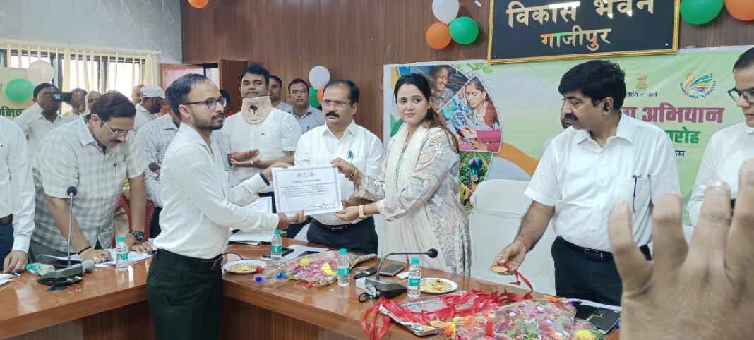 गाजीपुर। नीति आयोग द्वारा चयनित आकान्क्षात्मक विकास खण्ड कार्यक्रम के तहत शुक्रवार को विकास भवन सभागार में “सम्पूर्णता अभियान सम्मान समारोह” एवं “आकांक्षा हाट” का आयोजन किया गया। मुख्य अतिथि जिला पंचायत अध्यक्ष सपना सिंह ने दीप प्रज्जवलित कर शुभारंभ किया । इसके बाद मुख्य अतिथि व सीडीओ ने आकांक्षा हाट में विभिन्न विभागों की ओर से लगाये गए स्टालों का निरीक्षण करते हुए स्वयं सहायता समूह की महिलाओं द्वारा तैयार किये गए उत्पादों की प्रशंसा की। सम्पूर्णता अभियान सम्मान समारोह में डा. मो. तारिक जेयाद, सीएम फेलो विकास खण्ड-विरनो व विवेक सिंह, सीएम फेलो विकास खण्ड-वाराचंवर द्वारा सम्पूर्णता अभियान के सम्बन्ध में विस्तृत जानकारी दी गयी। उपायुक्त स्वतः रोजगार विजय कुमार यादव ने कहा कि सम्पूर्णता अभियान सम्मान समारोह केवल उपलब्धियों का उत्सव नहीं है।
