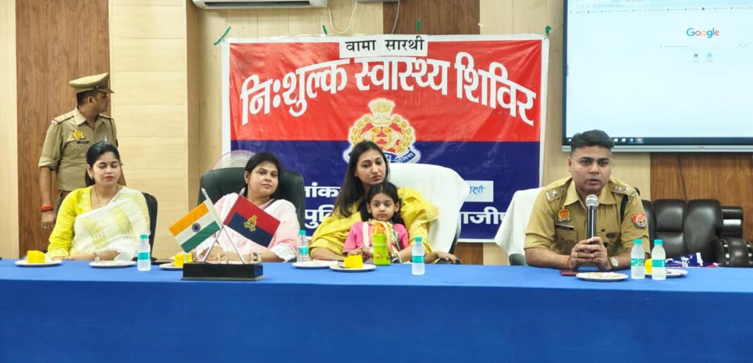 गाजीपुर। पुलिस महानिदेशक के वामा सारथी कैलेण्डर के के तहत नौ सितंबर को पुलिस लाइन सभागार में अध्यक्षा वामा सारथी कल्यानी वर्मा की उपस्थिति में निःशुल्क चिकित्सा शिविर का आयोजन किया गया । स्वास्थ्य शिविर में पुलिस परिवार के सदस्यों एवं आरटीसी के प्रशिक्षुओं का स्वास्थ्य परीक्षण किया गया । इसके साथ ही सभी लोगो को बीमारियों से बचाव के लिए जागरुक किया गया । पोषण के महत्व और जल जनित बीमारियों से बचाव के बारे में जागरुक किया गया। इस मौके पर पुलिस अधीक्षक डॉ0 ईरज राजा, अध्यक्ष वामा सारथी कल्यानी वर्मा पत्नी डा0 ईरज राजा (पुलिस अधीक्षक), प्रतिभा पत्नी ज्ञानेन्द्र नाथ प्रसाद (अपर पुलिस अधीक्षक नगर) व अंकिता पत्नी शेखर सेंगर (क्षेत्राधिकारी नगर), प्रतिसार निरीक्षक उमाकान्त त्रिपाठी, वामा सारथी में कार्यरत महिला आरक्षी, पुलिस लाइन चिकित्सालय स्टाफ आदि मौजूद रहे ।