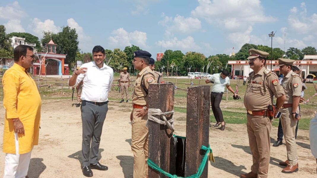 गाजीपुर। नवमी एवं दशहरा मेला को देखते हुए सोमवार को जिलाधिकारी अविनाश कुमार एवं पुलिस अधीक्षक डा0 ईरज राजा ने प्राचीन रामलीला लंका मैदान का स्थलीय निरीक्षण किया। निरीक्षण के दौरान उन्होने प्रवेश व निकास द्वार, विद्युत, प्रकाश, बैरिकेटिग, पार्किंग व्यवस्था की जानकारी ली। रामलीला कमेटी के अध्यक्ष को रामलीला मैदान की साफ सफाई एवं मेला में आने वाले लोगों के लिए पेयजल, शौचालय की व्यवस्था कराने का निर्देश दिया। इसके साथ ही रामलीला मैदान में लगने वाले दुकानों को सेक्टर के हिसाब से लगाया जाए। लंका मैदान में आने जाने के रास्ते में कोई दुकान नहीं लगाई जाएगी। यह पहले ही सुनिश्चित कर लिया जाये। लंका मैदान मे पर्याप्त प्रकाश की व्यवस्था रहे तथा ब्रैकेटिंग की व्यवस्था इस प्रकार से हो कि भीड़ को नियंत्रित किया जा सके । इस अवसर पुलिस अधीक्षक नगर ज्ञानेंद्र प्रसाद , क्षेत्राधिकारी सदर शेखर सेंगर ,मौजूद रहे।