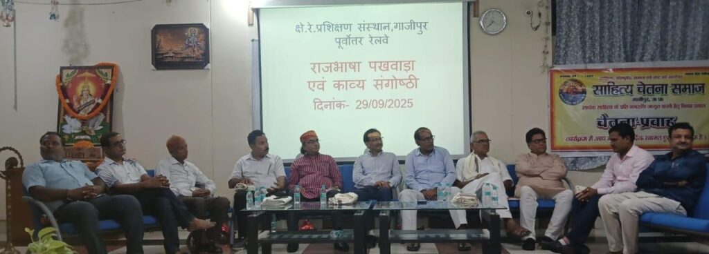 गाजीपुर। साहित्य चेतना समाज’की ओर से क्षेत्रीय रेल प्रशिक्षण संस्थान में राजभाषा पखवाड़ा के समापन समारोह में कवि-सम्मेलन का आयोजन किया गया। शुभारम्भ मुख्य अतिथि उप मुख्य सतर्कता अधिकारी पूर्व मध्य रेलवे सुबोध कुमार सिंह, प्रशिक्षण संस्थान के प्रधानाचार्य जयप्रकाश सिंह, कवि सम्मेलन के अध्यक्ष कामेश्वर द्विवेदी के साथ ही समस्त कवियों ने माँ सरस्वती के चित्र पर माल्यार्पण-पुष्पार्चन व दीप प्रज्वलन से हुआ। संस्थान के प्रधानाचार्य जयप्रकाश सिंह ने समस्त कवियों को अंगवस्त्र एवं उपहार प्रदान कर सम्मानित किया। साथ ही प्रशिक्षण संस्थान के पुरुष छात्रावास का नामकरण ‘रामधारी सिंह दिनकर छात्रावास’ एवं महिला छात्रावास का नामकरण ‘सुभद्रा कुमारी चौहान छात्रावास’ करने की घोषणा की। इसके बाद मुख्य अनुदेशक/प्रशिक्षण अरुण कुमार पाल द्वारा लिखित ‘परिचालन दर्पण’ पुस्तक का विमोचन हुआ।