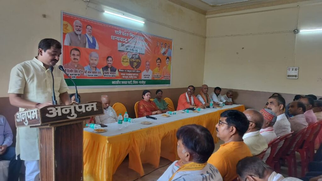 जीएसटी दरों में भारी कटौती से हमारे देश के लोगों को बहुत सारी बचत हुई है। उन्होंने कहा कि यह लाभ सिर्फ ग्राहक को नहीं बल्कि व्यापारियों को भी है। सामान जब सस्ता होगा तो व्यापार भी बढ़ेगा जब व्यापार बढ़ेगा तो मैन्युफैक्चर करने वाले लोगों की आर्थिक उन्नति भी होगी जिससे रोजगार के नए अवसर उपलब्ध होंगे। यह देश के लिए बड़ी बात है। उन्होंने विपक्ष पर निशाना साधते हुए कहा कि बहुत सी नकारात्मक ताकते देश को कमजोर करने का प्रयास कर रही है, अपरिपक्व सोच के विपक्षी नेता देश की जनता को गुमराह करना चाहते हैं । भ्रष्टाचार रहित सरकार ने प्रधानमंत्री नरेन्द्र मोदी के नेतृत्व में काम करते हुए बिना भेदभाव के बहुत बड़े साहसिक निर्णय लिया है। उन्होंने कहा कि मुख्यमंत्री योगी आदित्यनाथ के नेतृत्व में तेज गति से बढ़ रहा है विपक्ष बोल नहीं पा रहा है।विशिष्ट अतिथि विधान परिषद सदस्य विशाल सिंह चंचल ने कहा कि बिना किसी व्यापारी संगठनों, राजनैतिक दलो के मांग के सरकार ने जनता की जरूरतों को समझते हुए स्व निर्णय से जीएसटी स्लैब मे सुधार किया है जो भारत की अर्थव्यवस्था के लिए एक महत्वपूर्ण कदम है,और आम जनता के लिए एक बड़ा सहारा है।जीएसटी सुधार से भारत की अर्थव्यवस्था को नई दिशा मिलेगी। यह सुधार न केवल व्यापार को बढ़ावा देगा, बल्कि आम जनता के जीवन को भी आसान बनाएगा। उन्होंने कहा कि हमें विश्वास है कि जीएसटी के सुधार से भारत की अर्थव्यवस्था मजबूत होगी और विकास की गति बढ़ेगी।उन्होंने नाम लेकर बताया कि जीएसटी की घटी दरो से कई जीवन रक्षक वस्तुओं से दरें कम की गई हैं, जिससे आम जनता को राहत मिलेगी।