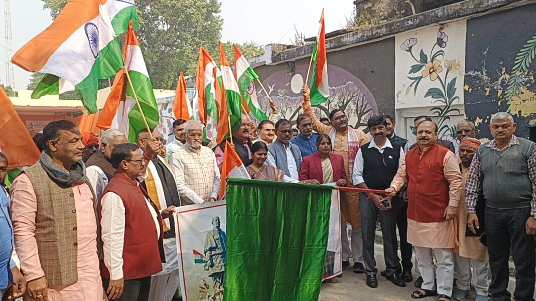 गाजीपुर। लौह पुरुष सरदार वल्लभभाई पटेल की 150 वीं जयंती के अवसर पर जिला प्रशासन ,मेरा युवा भारत, एनएसएस के संयुक्त तत्वधान में सदर विधानसभा क्षेत्र की पदयात्रा राइफल क्लब से प्रारंभ होकर शहर के विभिन्न मार्गो से होती हुई लंका मैदान में पहुंची। जहां समापन समारोह हुआ। राइफल क्लब में सरदार वल्लभभाई पटेल एवं भारत माता के चित्र पर भाजपा प्रदेश प्रवक्ता संजय चौधरी, सांसद राज्यसभा डॉक्टर संगीता बलवंत, जिलाध्यक्ष ओमप्रकाश राय,दीनदयाल परियोजना निदेशक,कपिलदेव उपनिदेशक ने माल्यार्पण किया। मुख्य अतिथि ने पदयात्रा को हरी झंडी दिखाकर रवाना किया। पदयात्रा में सरदार पटेल के चित्र के साथ सजाये गए रथ पर देशभक्ति पूर्ण नारे ,तिरंगा के साथ यात्रा प्रारंभ हुई ।लंका मैदान स्थित सभागार में संजय चौधरी ने कहा कि सरदार वल्लभभाई पटेल ने न केवल स्वतंत्र भारत के निर्माण में महत्वपूर्ण भूमिका निभाई बल्कि देश की एकता और अखंडता के लिए जो योगदान दिया वह सदैव याद रखा जाएगा । संजय चौधरी ने कहा कि आज का भारत उनके दूरदर्शी नेतृत्व और मजबूत इच्छा शक्ति का परिणाम है ।उन्होंने युवाओं से आवाहन किया कि वह सरदार पटेल के आदर्शों को अपनाकर राष्ट्र निर्माण में सक्रिय भागीदारी निभाए तथा प्रधानमंत्री के 2047 के पहले भारत को विकसित राष्ट्र की श्रेणी में ले आने में अपनी अग्रणी भूमिका निभाएं ।राज्यसभा सांसद डॉक्टर संगीता बलवंत ने कहा कि सरदार पटेल का योगदान आज भी भारत की एकता और अखंडता के लिए प्रेरणा स्रोत है । पटेल जी ने एक 562 रियासतों को एक सूत्र में पिरोकर राष्ट्रीय एकता को मजबूत किया तथा अखंड भारत की नींव रखी ।उनके आदर्श हमें याद दिलाते हैं कि देश हित को सर्वोपरि रखना चाहिए । इस मौके पर नगरपालिका अध्यक्ष सरिता अग्रवाल ,जिलाध्यक्ष ओमप्रकाश राय भानु प्रताप सिंह बिजेंद्र राय सुरेश बिंद, लालसा भारद्वाज,राजन प्रजापति, अखिलेश सिंह उपाध्यक्ष,सदर खंड विकास अधिकारी, जिला सूचना अधिकारी राकेश प्रजापति, शशिकांत शर्मा मीडिया प्रभारी, प्रीति गुप्ता अध्यक्ष नगर, अनुराग, सुभाष चंद्र प्रसाद, कालीचरण चौहान ,राजीव कुमार, सुमन बिंद आदि उपस्थित रहे। संचालन भाजपा अनुसूचित जनजाति मोर्चा के क्षेत्रीय अध्यक्ष विनोद खरवार ने किया।